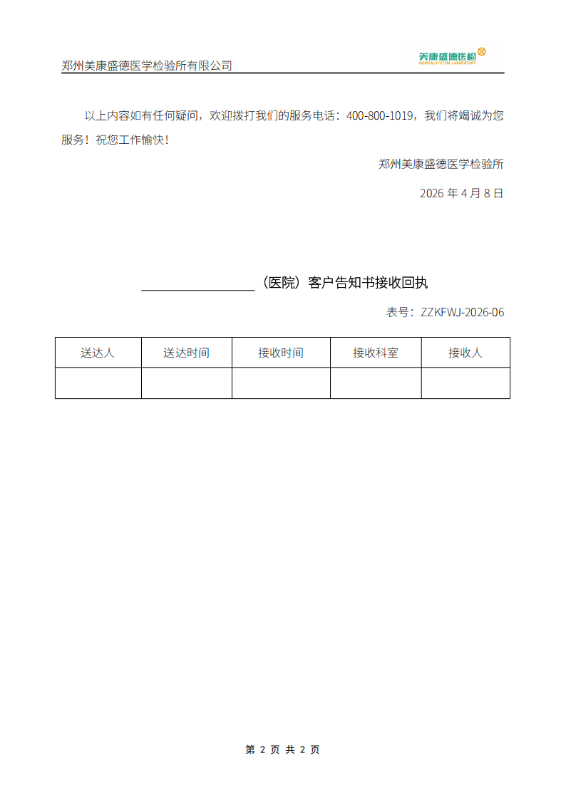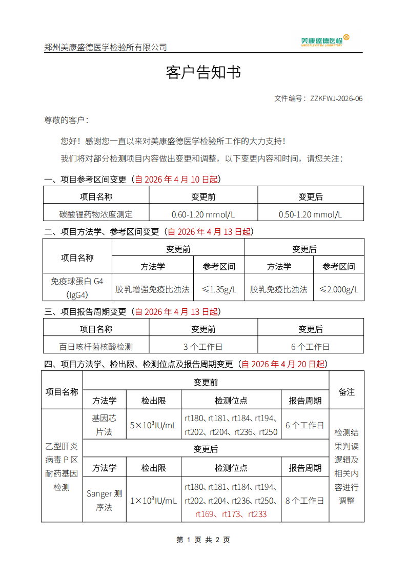 告客户书-郑州(部分项目方法学、参考区间变更)