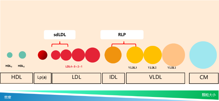 血脂指的是血液中的脂肪,像我们熟知的甘油三酯、胆固醇等。但血脂不溶水,必须与特殊的蛋白质结合形成球形的脂蛋白,才能在血液中运输,根据密度的差异,脂蛋白可分为乳糜微粒(CM)、极低密度脂蛋白(VLDL)、中密度脂蛋白(IDL)、低密度脂蛋白(LDL)、脂蛋白(a)、高密度脂蛋白(HDL)。脂蛋白亚组分就是在上述脂蛋白类别内部,进一步细分出的类型。比如,LDL可以细分为LDL1、LDL2、LDL3、LDL4等亚型。