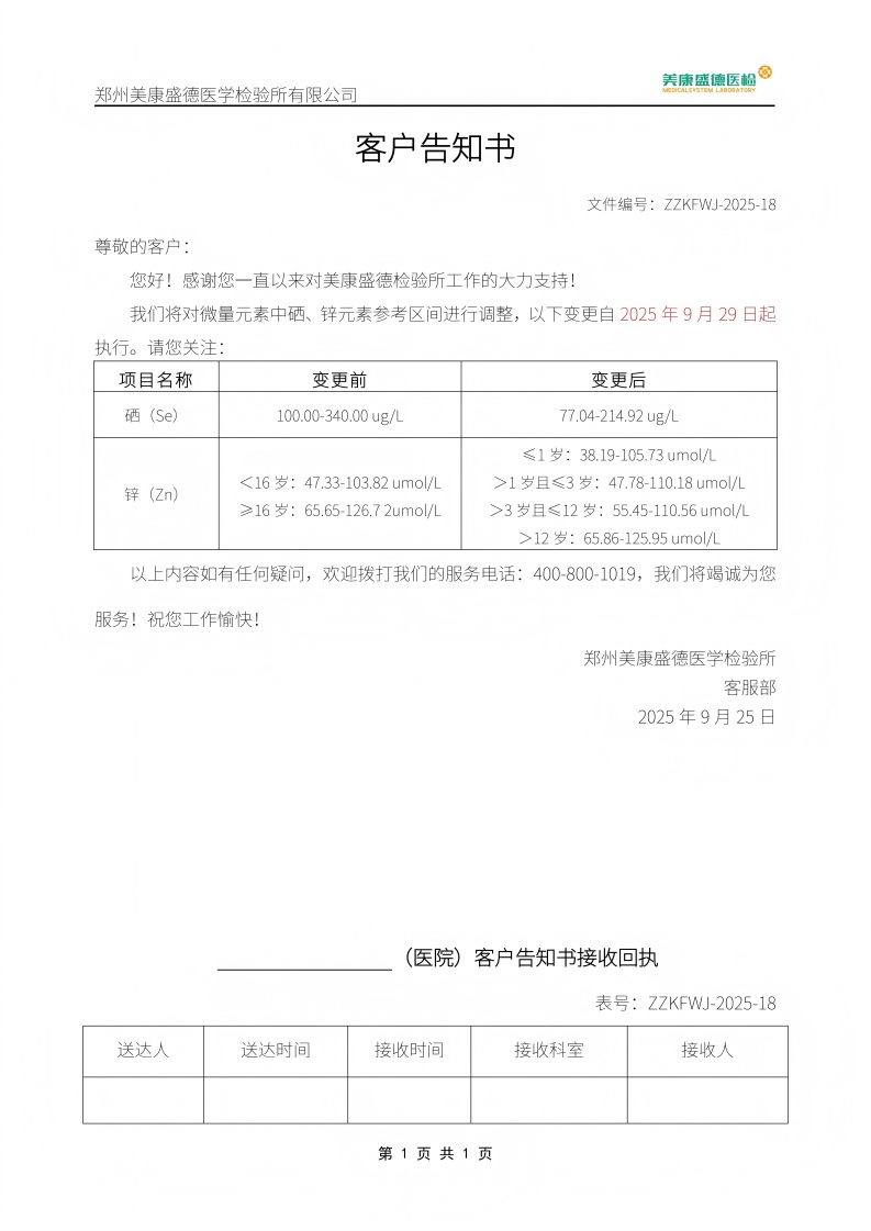 告客户书-郑州(关于微量元素硒、锌参考区间变更)