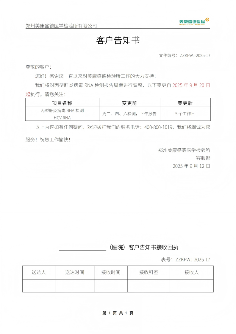 告客户书-郑州(关于丙型肝炎RNA报告时间变更)
