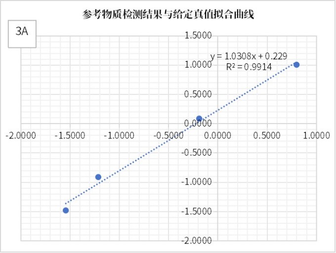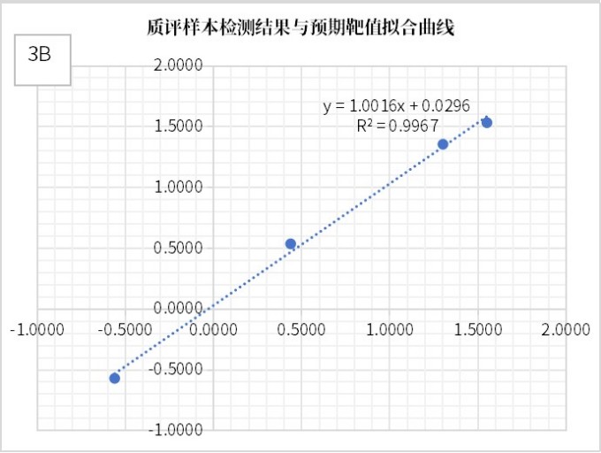 美康盛德医检实验室利用自主研发的检测体系进行分析,结果显示:检测值与真值的回归拟合度优异(R²=0.9914)(见图3-A),并由此获得转换系数CF=0.5902。进一步,将CF应用于质评样本的转换后结果,再与回报的预期靶值进行拟合分析,所得拟合度R²高达0.9967(见图3-B)。表明转换后的检测结果与预期靶值高度一致。