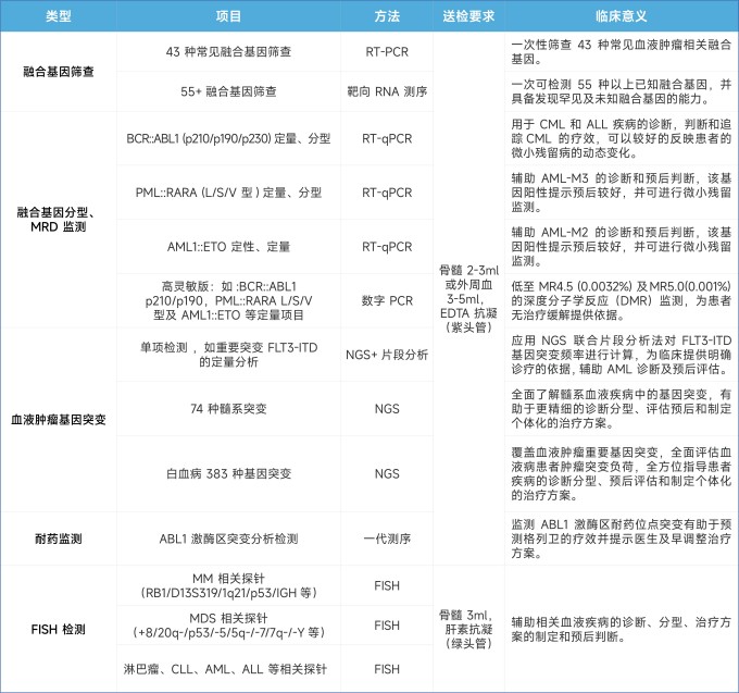 美康盛德医检依托RT-qPCR、数字PCR、NGS(二代测序)、纳米孔测序、FISH(荧光原位杂交)及一代测序等技术平台,构建了覆盖血液肿瘤全病程管理的分子检测体系,涵盖鉴别诊断、精准分型、预后评估、微小残留病(MRD)监测、风险分层与耐药监测等关键环节,为临床提供贯穿诊疗全程的精准决策依据。