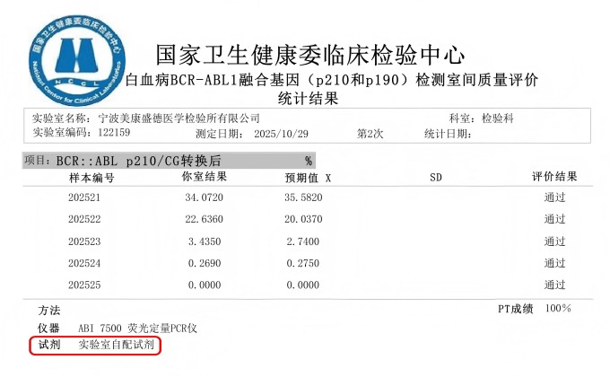 PT认证!美康自研方法满分通过卫健委白血病BCR::ABL1室间质评
