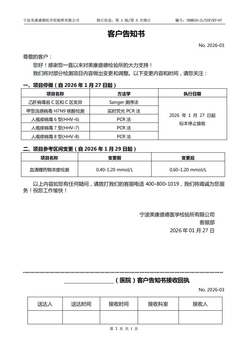 告客户书-宁波(关于部分检测项目内容变更)