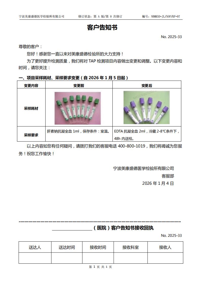 告客户书-宁波(关于异常糖链糖蛋白检测(TAP)项目内容变更)