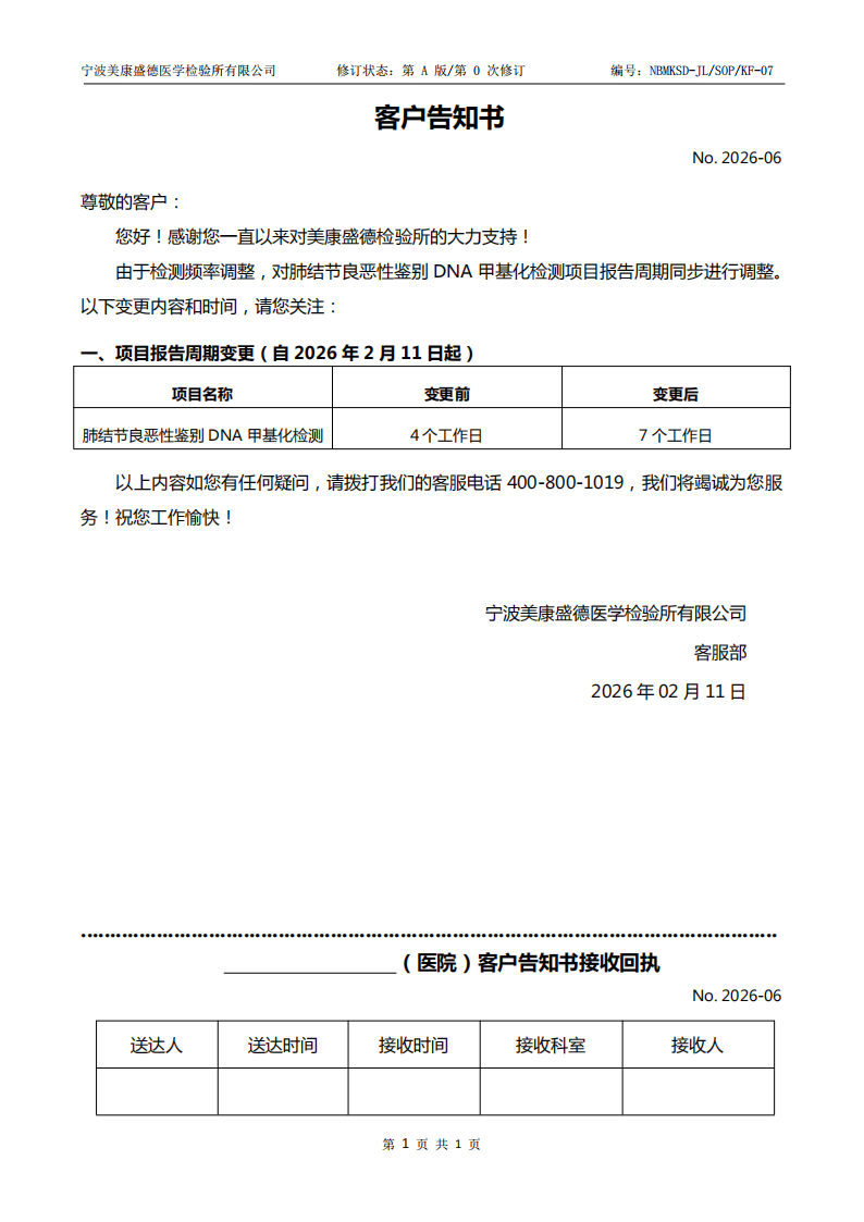 告客户书-宁波(关于肺结节良恶性鉴别DNA甲基化检测项目报告周期变更)
