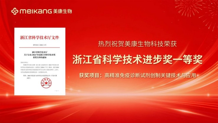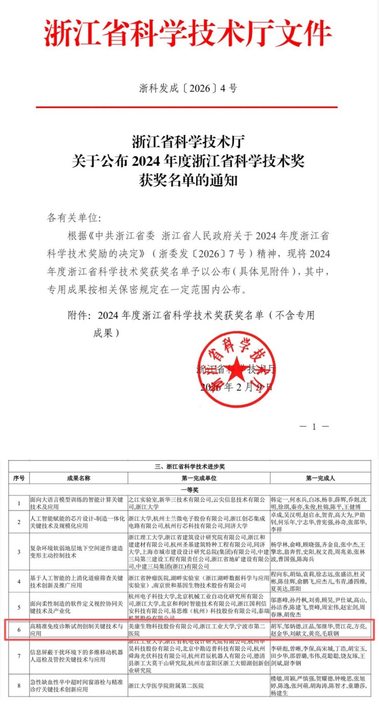 美康生物科技股份有限公司作为第一完成单位,牵头完成的 “高精准免疫诊断试剂创制关键技术与应用” 成果,荣获2024年度浙江省科学技术进步奖一等奖。