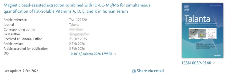[1] Magnetic bead-assisted extraction combined with LC-MS/MS for simultaneous quantification of Fat-Soluble Vitamins A, D, E, and K in human serum. Talanta. https://doi.org/10.1016/j.talanta.2026.129520.